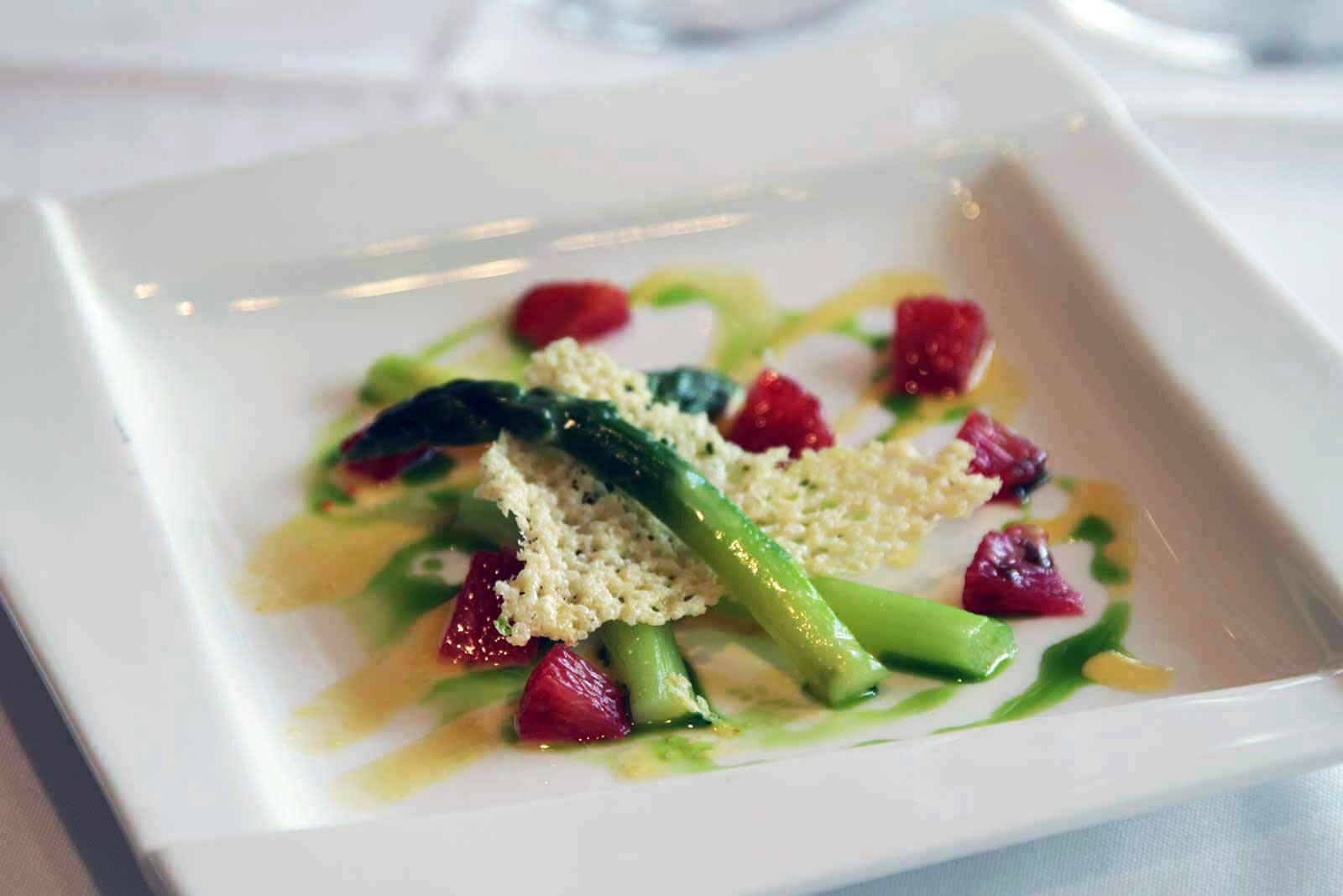 Private dining room with set tables and projection of Chez Catherine logo on projector screen